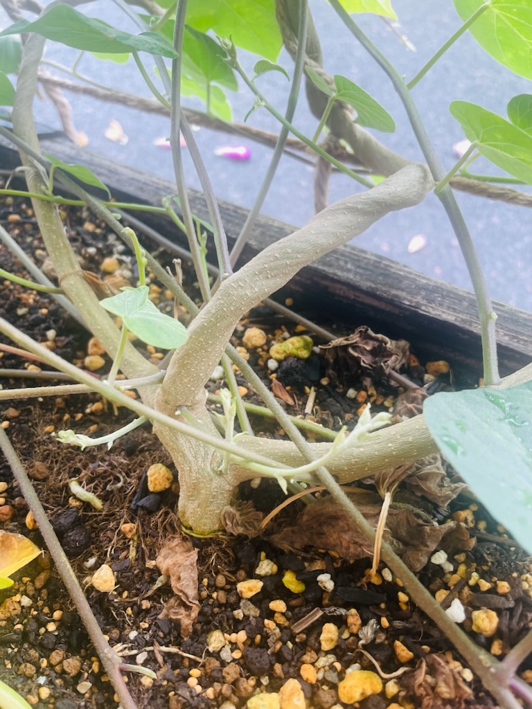 秋の足音近づく今日この頃。 今年もグリーンカーテンは熱中症気味になり、葉が黄色く枯れてくる現象が。 とはいえ、すくすく育ち屋上への背丈の大きなカーテンに育ってくれました。 足元となるプランターの根元部分は、もはや低緑樹なみの茎の太さ。 きっと根がびっしり張り巡らせて、水を吸収してこの巨大なカーテンを支えているのでしょうね。