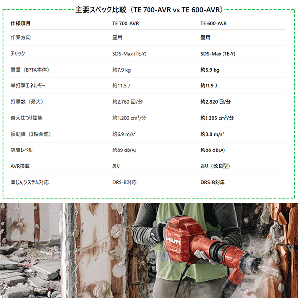 従来モデル(TE700-AVR)よりも約25%軽量化されながら、打撃力は 11.9J、最大ハツリ性能は 1395cm³/min とパワーをしっかり確保しています。
