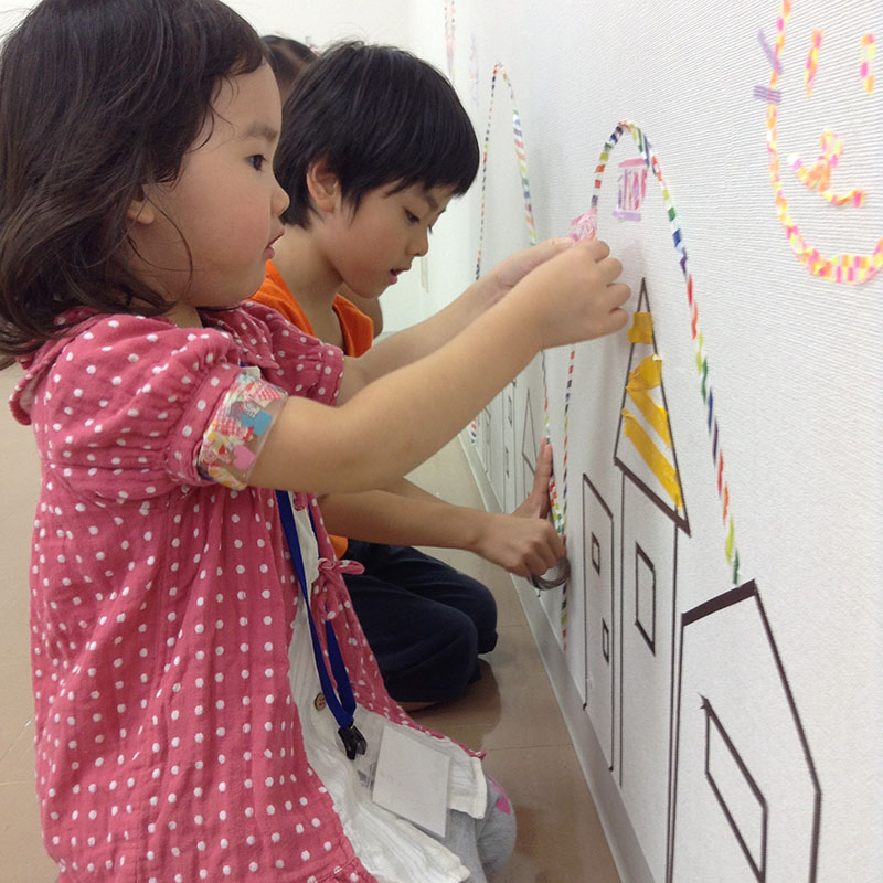 カラフルなマスキングテープを壁に貼って絵を描く、工作するワークショップ。落書きをモジり「楽しみながら貼る」を略して「RAKUBARI<ラクバリ>」とネーミングしました。